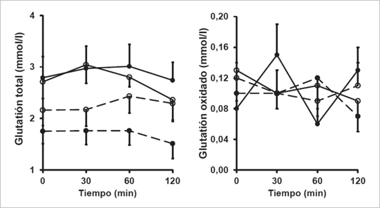 La concentración de glutatión total (GSH) y oxidado (GSSG) se determinó mediante un ensayo de reciclaje enzimático basado en la acción de la glutatión reductasa25,26. Este ensayo tiene un error intra- e inter-ensayo < 1% y 2%, respectivamente. La medición de GSH y GSSG se realizó de forma paralela en las muestras sanguíneas extraídas en los tiempos -10, 30, 60 y 120 min. A partir de estos valores se determinó el área bajo la curva (AUC) mediante el método del trapezoide.