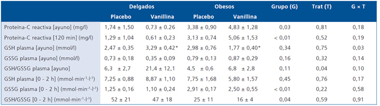 La concentración de PCR en individuos obesos respecto a delgados fue mayor cualquiera sea la condición evaluada (Tabla 2). No se observó cambios en la concentración de PCR en la transición ayuno-postprandial (p = 0,50) o en respuesta a la vanillina (p = 0,66).