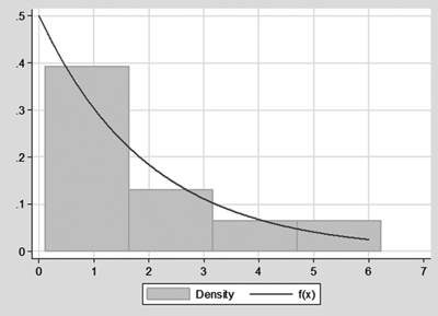 El siguiente gráfico muestra el histograma de la variable -2ln(p) y la curva corresponde a la función densidad de probabilidades de la c2 con dos grados de libertad: