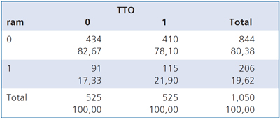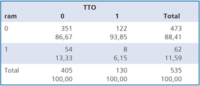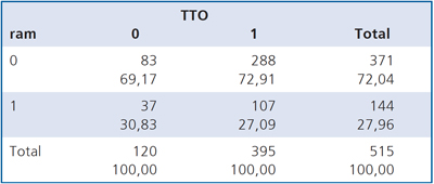 El tratamiento 1 presenta una tasa de RAM del 27,09% y el tratamiento 0 una tasa de RAM del 30,83%, la asociación no fue significativa (p-value = 0,423) y un OR = 0,83.