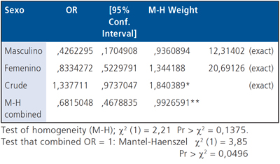 Un análisis epidemiológico básico, nos indicaría la precaución de ajustar los resultados por sexo, pues hay una evidente diferencia. Esta diferencia nos lleva a dos conclusiones distintas: la primera es que en ambos sexos el tratamiento 1 protege de hacer RAM, sólo que en las mujeres falta tamaño de muestra para rechazar la hipótesis de independencia. O bien que el tratamiento 1 sólo protege de hacer una RAM a hombres. ¿Cómo saberlo? Si la segunda conclusión fuera la cierta habrían antecedentes clínicos, epidemiológicos o en las ciencias básicas que harían plausible la conclusión. Así es que supongamos que la primera conclusión es la correcta, en este escenario, habría que estimar una asociación (OR) entre RAM y tratamiento, ponderando dichas asociaciones por sus respectivos tamaños de muestras. Una forma de resolver este problema hacer esta estimación del OR mediante el método de Mantel y Haenszel, el que permite construir un OR más “potente” que los conseguidos en la estratificación, pero no se calculan a partir de la primera Tabla, en que no se distinguen los géneros. Los resultados de este OR combinado se muestran a continuación: