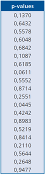 Una verificación empírica de este resultado es la siguiente, suponga que se obtienen 20 p-values obtenidos de un mismo test estadístico sobre muestras obtenidas de la misma población, como los tamaños de muestra de cada test son distintos, no necesariamente se obtienen p-values significativos, y estos podrían ser: