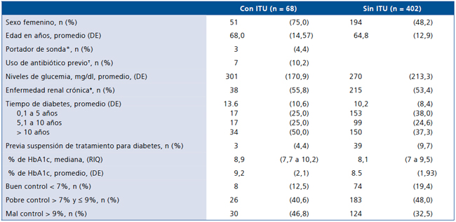 Se analizaron datos de 470 pacientes que ingresaron con diagnóstico de DM2. La edad promedio 65,2 años (DE 13), 52% mujeres. El 14,4% (n = 68) tenían ITU al ingreso, no se documentaron ITU nosocomiales.
