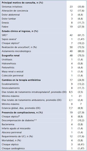 La media de días de antibioticoterapia fue 8,5 días (DE 3,5), rango 1 a 21 días. En la mitad de los pacientes se continuó el tratamiento de manera ambulatoria durante un promedio de 2,1 días (DE 2,4), rango de 1 a 7 días. La estancia global fue de 7,7 días en promedio (DE 8,9); no se encontraron diferencias en el tiempo mediano de estancia hospitalaria entre los paciente con y sin ITU (p = 0,76). Las complicaciones se presentaron en un 27,9% (n = 19) siendo el choque séptico y la bacteriemia las más frecuentes, con un 8,8% (n = 6) y un 5,8% (n = 4) respectivamente; de estos el 52,6% (n = 10) tuvieron como comorbilidad importante ERC (enfermedad renal crónica) en estadios IV y V.