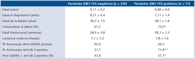 Los pacientes con DM1 cuyo perfil de anticuerpos anti- tTG fue positivo mostraron valores significativamente mayores de cetoacidosis (73,5% vs 61,2%, p < 0,05) y una mayor positividad del anticuerpo anti-IA-2 (71,4% vs 51,1%, p < 0,01).