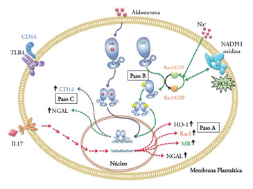 En nuestro estudio la señalización inducida por IL- 17A a través de su receptor, podría inducir, en un primer paso la expresión de MR, RAC-1A y HO-1 (Figura 1, paso A). Después de la traducción, esta GTPasa podría activarse por el consumo de sal o el estrés oxidativo celular y activar al MR en forma independiente de la aldosterona (Figura 1, paso B), induciendo la expresión de genes blancos del MR como NGAL, que produciría daño endotelial e inflamación (Figura 1, paso C). Nuestros resultados nos sugieren que los niveles plasmáticos de esta citoquina, IL-17, podría modular la activación de los mononucleares de manera dependiente de MR pero independiente de los niveles plasmáticos de aldosterona llevando a una inflamación subclínica, y posteriormente a daño endotelial e HTA.