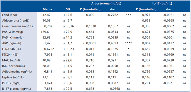 Los indicadores metabólicos muestran que el grupo total presentó un IMC de 28,03 ± 4,5 (kg/m2) con un 25% de obesos. Los niveles circulantes de adiponectina de 6,8 ± 3,9 (ug/mL) y de leptina de 13,1 ± 9,1 (ng/mL) fueron normales. Finalmente los marcadores de inflamación muestran que estos pacientes tienen niveles de PCRus de 3.474 ± 6,6 (mg/L) y de IL-17 plasmática de 7.883 ± 29,5 (pg/mL). Se observó que los niveles circulantes de aldosterona se asociaron negativamente con la edad (p < 0,001; rho = -0,02762) y negativamente FENa24h (p = 0,013; rho = -0,1825), pero no se asoció con los niveles plasmáticos de IL-17. A su vez la IL-17 no se asoció con ninguno de los parámetros plasmáticos tanto clínicos como bioquímicos como se observa en la Tabla 2.
