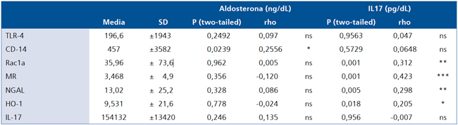 Los resultados de la expresión de los genes blanco en PBMCs y su asociación con aldosterona o IL17 plasmática se muestran en Tabla 3. Destaca, la asociación positiva entre aldosterona y la expresión de CD14 en estas células (p = 0,024; rho = 0,2556). Por otra parte, IL17 plasmática se asoció positivamente con Rac1a (p = 0,001; rho = 0,3124), MR (p = 0,001; rho = 0,423), NGAL (p = 0,005; rho = 0,248) y HO-1 (p = 0,018; rho = 0,2045).
