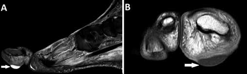 A MRI of the right foot was performed to evaluate the possibility of infection in surrounding tissues and osteomyelitis. The MRI demonstrated a skin blister in the plantar aspect of the distal phalanx of the hallux (Figure 2) and a discreet peripheral contrast enhancement, without any signs of infection.