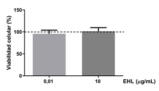 Se evaluó la viabilidad celular en presencia de 0,01 μg/mL y 10 μg/mL de EHL, respecto al grupo control. Las células HepG2 se trataron con 0,01 y 10 μg/mL de EHL durante 24 h. Posteriormente se agregaron 20 μl de solución del compuesto 3-(4,5-dimetiltiazol-2-il)- 5-(3-carboximetoxifenil)-2-(4-sulfofenil)-2H-tetrazolio (MTS) por pocillo (100 μl), y se registró la absorbancia después de 3 h a 490 nm (y a 630 nm para restar la absorbancia de base).