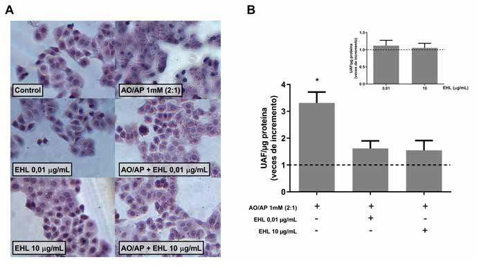 expusieron por 24 h a 1 mM AO/AP (2:1) en presencia o no de 0,01 o 10 μg/mL de EHL. Se utilizó la expresión de GAPDH como control interno. La línea punteada