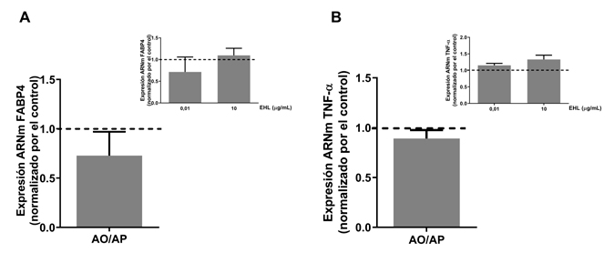 Como se aprecia en la figura 4A-B, la mezcla AO/AP no tuvo efecto sobre la expresión de FABP4 y TNF-α en relación al control. Asimismo, EHL no induce cambios en la expresión de estos genes respecto al grupo control.