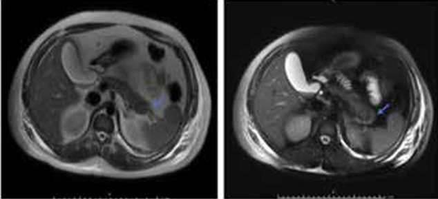 Figura 1: Resonancia nuclear magnética de abdomen. Lesión focal en la cola