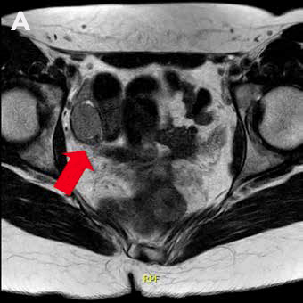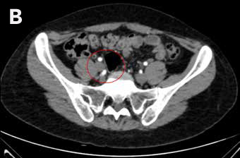 Mujer de 27 años, con antecedente de amenorrea primaria con hábito femenino, mamas Tanner V, escaso vello no terminal axilar y púbico, y que tenía pareja heterosexual y vida sexual normal. Sus exámenes hormonales demostraron testosterona en rango masculino (Tabla 1) y cariograma 46,XY compatible con insensibilidad a andrógenos. La TAC de pelvis mostró ausencia de útero, una imagen ovoidea con densidad de partes blandas de 27 mm de diámetro mayor a nivel de la bifurcación de los vasos iliacos derechos interpretada como ovario normal, y en situación anexial izquierda una masa sólida de 90 mm de diámetro mayor, bien delimitada algo heterogénea sin calcificaciones, sin liquido libre ni adenopatías (Figura 2). Fue sometida a gonadectomía bilateral 4 años antes de la consulta y la biopsia demostró un seminoma espermatocítico de 11 cm asociado a un foco de neoplasia germinal intratubular de 2 mm en la gónada izquierda y un testículo atrófico y fibroso, con epidídimo de aspecto conservado a derecha.