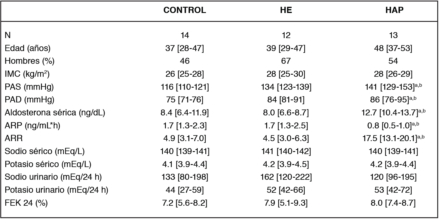 El grupo control incluyó 13 sujetos, de los cuales 6 fueron hombres y 7 mujeres, el grupo HE incluyó 12 sujetos de los cuales 8 fueron hombres y 4 mujeres, y el grupo HAP incluyó 13 sujetos de los cuales 7 fueron hombres y 6 mujeres. En el grupo HAP, se observó mayor PAD (86 [76-95] vs 84 [81- 91] vs 75 [71-76] mmHg, p= 0,0003) y PAS (141 [129-153] vs 134 [123-139] vs 116 [110-121] mm Hg, p= 0,0005) que el grupo HE y control respectivamente (Tabla 1). El grupo HAP mostró una mayor concentración de aldosterona que el grupo HE (12.7 [10.4-13.7] vs 8.0 [6.6-8.7] ng/dL, p= 0,0019) y el grupo control (12.7 [10.4-13.7] vs 8.4 [6.4-11.9] ng/dL, p= 0,0149) (Figura 1a). Por otro lado, la ARP fue menor en el grupo HAP que en el grupo HE (0.8 [0.5-1.0] vs 1.7 [1.3- 2.5] ng/mL*h, p= 0,0001) y el grupo Control (0.8 [0.5-1.0] vs 1.7 [1.3-2.3] ng/mL*h, p= 0,0001) (Figura 1b). Cuando se comparó la ARR, se observó diferencias significativas entre el grupo HAP y el grupo HE (17.5 [13.1-20.1] vs 4.5 [3.0-6.3], p= 0,0001), y entre HAP y el grupo control (17.5 [13.1-20.1] vs 4.9 [3.1-7.0] p= 0,0001) (Figura 1c).