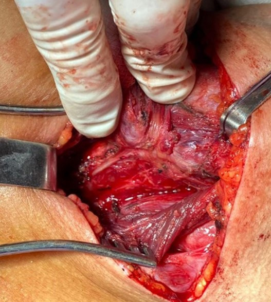 Figura 1: Se evidencia lóbulo tiroideo rebatido medialmente con importante