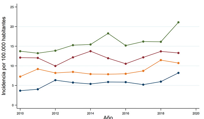 Durante el estudio observamos un gran aumento en la incidencia en la población menor de 5 años, a pesar de que no fue estadísticamente significativo, podemos observar que la incidencia aumentó más del doble en el período estudiado (3.67 en el año 2010 a 8.20 en el año 2019 por 100.000 hab/año). Este aumento ya había sido observado previamente, por el grupo de Eyzaguirre y colaboradores9.
