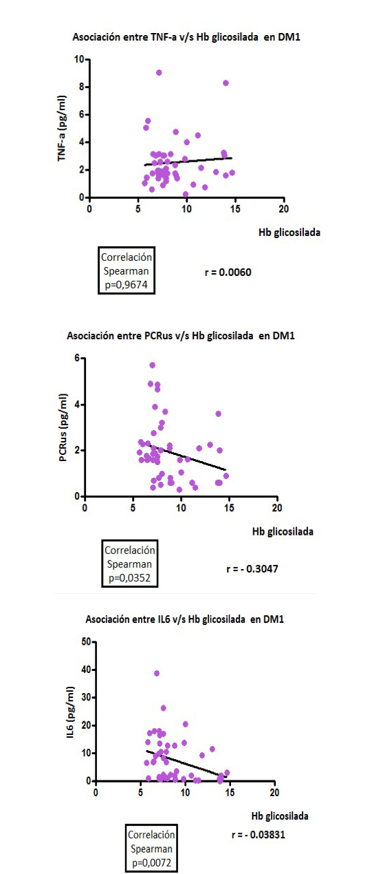 Figura 2: Asociación entre marcadores de inflamación y Hb glicosilada en pacientes con DM1. Discusión