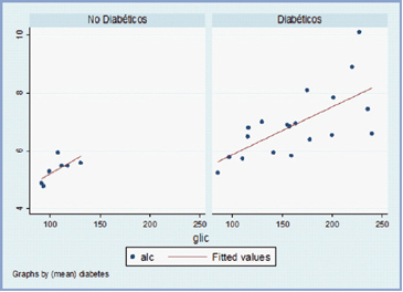 DM: Diabetes Mellitus. En el total de individuos estudiados; al analizar las relaciones de las variables se encontró una correlación positiva y significativa entre los niveles de HbA1c y los promedios de glicemias r: 0,77, p < 0,0001 (Figura 1); situación similar se presentó entre las fructosaminas y las glicemias r: 0,69, p < 0,02 (Figura 2). En los pacientes diabéticos en diálisis la determinación de la fructosamina no mostró correlación significativa con las glicemias promedio (Figura 4). La correlación de la glicemia promedio con la HbA1c en los no diabéticos es de un 69,56% p = 0,08 y para los diabéticos es de un 66,79% p = 0,001 (Figura 3). La fructosamina fue un parámetro inferior a la HA1c para evaluar el control metabólico en los pacientes diabéticos estudiados.
