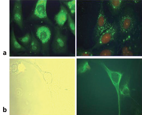 Se sembró sobre cubreobjetos de vidrio en placas de 6 cm de diámetro a baja confluencia. Una vez adheridas las células se lavó las placas con PBS. Se fijó con metanol frio (-20°C) por 30 min. Se lava con PBS (3 veces, 5 min cada vez) luego se bloquea con Suero Normal de Caballo 10% por 20 min. Se lava 3 veces con PBS, y se incuba con anticuerpo primario a 4°C toda la noche. Se utilizó anticuerpo anti PTH humana (N-18) de cabra 1:100 (Santacruz Inc) y anti PTH humana de conejo 1:200 (Abcam - ab53040) y Anti CaSR (receptor de calcio sensible) Humano de ratón 1:100 (Chemicon). Luego se lava 3 veces con PBS y se incuba con anticuerpo secundario Anticabra biotinilado (20 μg/ml - Vectorlabs) y Antiratón conjugado con FITC (20 μg/ml - Vectorlabs), por 1,5 h. Se lava con PBS, se montan los cubreobjetos en portaobjetos de vidrio con medio de montaje para fluorescencia (Dako). Se observa fluorescencia en microscopio Karl Zeiss, digitalizando imágenes con cámara Cool Snap sf. Como control positivo se utilizó tejido paratiroídeo criopreservado y cultivado de otros pacientes.