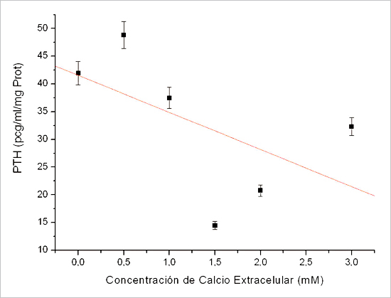 Realizando una regresión lineal con el Software Origin 7.0 pro, se obtuvo la curva de tendencia (en rojo), que demuestra que a mayor concentración de calcio extracelular, menor es la secreción de PTH en el medio.