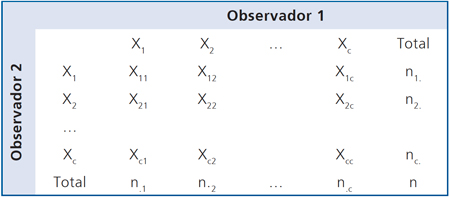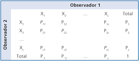 Es claro que 0 ≤ π ≤ 1. Por otra parte, como se está asumiendo que los observadores son independientes, la probabilidad de coincidencia por azar para cada celda de la diagonal estará dada por: