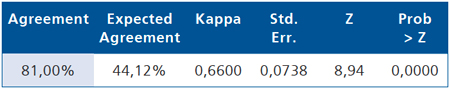Es decir se observa un acuerdo del 81%, el acuerdo esperado por azar es de 44,12%, el valor del índice K es 0,66 y es significativamente mayor que 0 (p-value = 0,0000), de acuerdo a la escala de valoración de K, se está en presencia de una buena concordancia.
