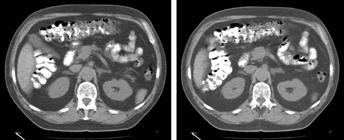 Paciente con antecedente de hipertensión arterial grave que, en un estudio realizado 4 años antes, demostró tener hiperaldosteronismo primario, certificado por elevación de aldosterona plasmática (25,6 ng/dL), supresión concomitante de ARP (<0.2 ng/mL/h) y elevación de la relación AP/ARP (85,3). Además, presentaba hipokalemia (2,7 mEq/L), natremia (140 mEq/L) y funcion renal normal (creatinina 0.87 mg/dL). El estudio con TAC de abdomen mostro engrosamiento nodular de ambas glandulas suprarrenales, siendo este mas notorio a izquierda (Figura 1). Quedo en tratamiento con Espironolactona 50 mg/d, Enalapril 10 mg/d y Amlodipino 10 mg/d. Evoluciono con ginecomastia bilateral progresiva, sintomatica, por lo que fue derivado a Endocrinologia para reevaluacion del hiperaldosteronismo. Suspendida la Espironolactona, se solicitaron nuevos examenes: Aldosterona 40,2 ng/dL, ARP 0,6 ng/mL/h, AP/ARP: 67, sodio 140 mEq/L, potasio 4.5 mEq/L. Dada la gravedad de su hipertension no se efectuo una prueba confirmatoria con fludrocortisona o infusion salina. La RM de abdomen mostro ambas glandulas suprarrenales hiperplasicas de tipo multinodular, con predominio a izquierda y con un nodulo de 19 mm de diametro. Para completar el estudio se realizo un CVS con infusion de ACTH (50μg/h), que fue satisfactorio y concluyo hipersecrecion de aldosterona de la glandula derecha, sin supresion de la glandula izquierda (Tabla 1a), concluyendose que se trataba de una hiperplasia suprarrenal bilateral. Se inicio tratamiento con Epleronona.