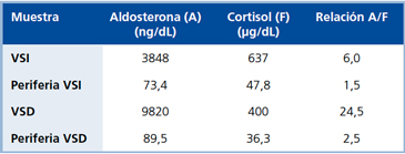 Tabla 1b. Resultado del CVS del caso clínico 2, que muestra lateralización a derecha de la secreción de aldosterona.