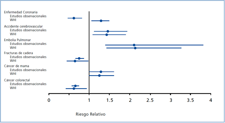 Figura 1. Relación entre la TH de la postmenopausia y varios objetivos clínicos en los estudios observacionales y en el estudio WHI con estrógenos más progestinas17