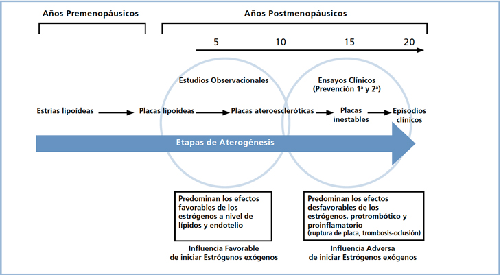 Esta misma hipótesis ha sido corroborada en un modelo animal. En monas ooforectomizadas, aquellas que usan precozmente TH desarrollan 50% menos de placas coronarias en comparación con las controles; si la sustitución se inicia 2 años más tarde, lo que equivale a 6 años en humanos, la TH no detiene la progresión de las placas ateroscleróticas14.