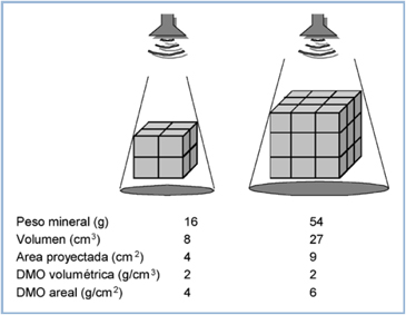 La placa receptora capta la proyección desde una fuente emisora del haz de rayos X que atraviesa un tejido y expresa en “pixeles” el área a evaluar. Esta proyección es bidimensional y da una valoración no siempre real de la DMO de tejidos de igual contenido mineral, debido a un efecto de interpretación del programa en el computador (Figura 1). Valgan al respecto dos ejemplos aclaratorios: