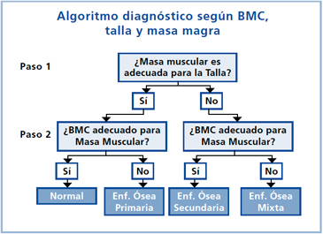En nuestra Unidad de Metabolismo Óseo, se realiza un enfoque dinámico basado en el diagrama de flujo propuesto por Schönau1 (Figura 2). El principal determinante de la evaluación es considerar un “contexto armónico” para efectuarla, que incluya tamaño óseo (talla), composición corporal corporal/ peso (masa magra y grasa) y, finalmente, CMO total y de los segmentos estudiados. Un enfoque inicial considerando la masa magra (LBM), que refleja el contenido muscular, es una aproximación adicional importante dado que ella se afecta frecuentemente en patologías pediátricas que tienen alteración del CMO. Este análisis permite diferenciar enfermedades primarias, secundarias o mixtas del hueso con respecto a niños normales (Figura 2).