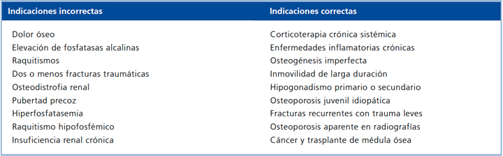 Tabla 1. Indicaciones correctas e incorrectas del uso de DXA en niños.