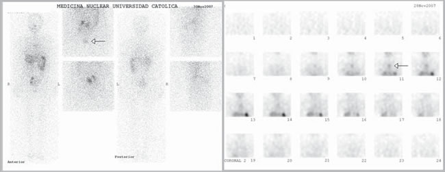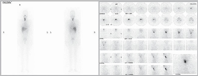Mujer que a los 37 años de edad le fue diagnosticado un cáncer papilar de tiroides. La ecografía tiroidea inicial mostró un nódulo de 13,4 mm de diámetro en lóbulo derecho (LTD), heterogéneo, hipoecogénico, de márgenes irregulares, con microcalcifi caciones, y además, dos nódulos de características benignas en lóbulo izquierdo (LTI) de 5 y 8 mm. La punción aspirativa con aguja fina del nódulo derecho confirmó que se trataba de un carcinoma papilar del tiroides. Se efectuó tiroidectomía total; el estudio histológico describió cáncer papilar del tiroides, multifocal (un foco en LTD de 12 mm y 2 focos en LTI de 10 y 3 mm), variedad folicular, infiltrante hasta la cápsula en ambos lóbulos, con extensión al tejido adiposo peritiroideo y permeación vascular. Además, cuatro de diez ganglios del grupo VI izquierdo presentaban compromiso metastásico tumoral. Post cirugía recibió 200 mCI de I131; inmediatamente antes de esa dosis terapéutica tenía TSH: 54,2 uUI/mL, tiroglobulina (Tg): 35,4 ng/dL con negatividad de los anticuerpos anti tiroglobulina (Ac antiTg). La exploración sistémica post I131 mostró dos zonas confluentes de captación del radiofármaco alineadas en posición paramediana derecha y baja del cuello y una pequeña zona de menor intensidad en el lecho tiroideo derecho (Figura 1). Estos hallazgos fueron interpretados como metástasis ganglionares del grupo VI y un pequeño remanente tiroideo.