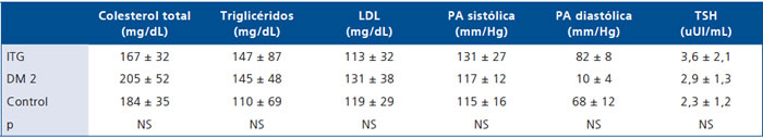 Con respecto a los valores del perfil lipídico, los pacientes DM registraron un promedio de colesterol total y LDL levemente superiores a los ITG y OBC, pero sin ser significativo. No se observaron diferencias en los promedios de presión arterial sistólica ni diastólica; sin embargo, se diagnosticaron 7 pacientes con prehipertensión y 3 pacientes con hipertensión, los que se distribuyeron en todos los grupos. La función tiroidea no mostró diferencias significativas aunque se aprecia una tendencia a mayor TSH en los ITG y DM2 respecto de los C. No hubo pacientes con hipotiroidismo, pero 3 pacientes (1 en cada grupo) presentaron una TSH elevada pero < de 10 uUI/mL, compatible con hipotiroidismo subclínico (Tabla 3).