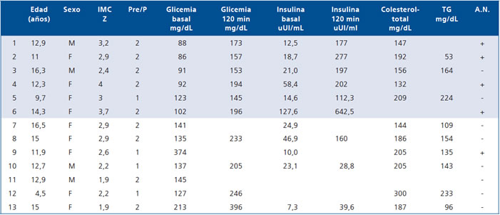 En la Tabla 4 se describen individualmente las características clínicas y de laboratorio de los 13 pacientes obesos que presentaron ITG (n: 6) o DM2 (n: 7) (6 diagnosticados en este estudio y 7 previamente). El diagnóstico de DM2 se estableció sobre bases clínicas y sólo en algunos pacientes se realizó estudio de reserva pancreática con medición de Péptido C o auto-anticuerpos, exámenes que apoyaron el diagnóstico de DM2.