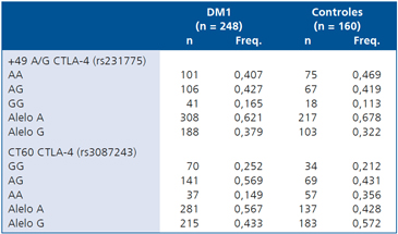 El gen CTLA-4 se encuentra en el cromosoma 2 (2q33). Los polimorfismos en el gen CTLA-4 se han asociado previamente a DM1 en varias poblaciones8-10. Dos de los polimorfismo de un solo nucleótido (SNP) en el gen CTLA-4, +49 A/G (rs 231775) y CT60 (rs 3087243), han sido implicados en una serie de enfermedades autoinmunes, incluyendo la cirrosis biliar primaria, lupus eritematoso sistémico, artropatías inflamatorias crónicas y enfermedad celíaca11-14.