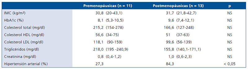 El grupo de mujeres premenopáusicas estuvo formado por 11 pacientes (8 DM1 y 3 DM2) y el de menopáusicas 13 diabéticas (3 DM1 y 10 DM2), con promedio de edad 39 años (rango 19-49); significativamente menor (p < 0,0001) que el grupo de postmenopáusicas, 61 años (49-75). Destacamos que la duración de la DM fue similar, en las premenopáusicas 17,6 años y en las postmenopáusicas 14,1 años (NS).