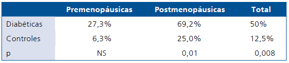 Finalmente se confirma la existencia de DS en las mujeres diabéticas, el que nosotros la encontramos presente en el 50% de éstas y 12,5% en el grupo control (p = 0,008).