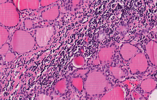 Figura 2. A: Se observan folículos tiroideos del parenquima normal con un área adyacente de inflamación crónica linfoplamocitaria infiltrante. 20x H-E.