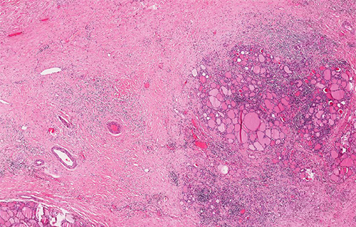 Las secciones microscópicas estudiadas en el lóbulo derecho exclusivamente muestran un parénquima tiroideo infiltrado por un tejido fibrocolágeno acompañado de un infiltrado inflamatorio constituido principalmente por linfocitos y algunas células plasmáticas, sin evidencia de formación de folículos linfoides. El parénquima tiroideo conservado presenta focos de atrofia folicular tiroidea. Además, dicha fibrosis e inflamación se extiende a tejido adiposo y muscular estriado adyacente. El lóbulo izquierdo no presenta alteraciones histopatológicas significativas (Figura 2); siendo todo ello compatible con el diagnóstico de tiroiditis fibrosante de Riedel con afectación unilateral (lóbulo tiroideo derecho).