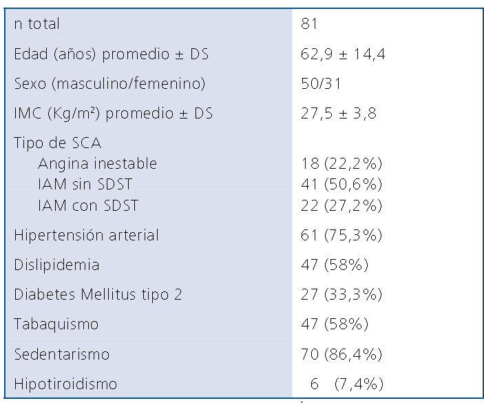 Del total de pacientes, 61 (75,3%) tenían HTA, 47 (58%) dislipidemia, 27 (33,3%) DM2, 47 (58%) eran fumadores y 70 (86,4%) sedentarios (Tabla 1).