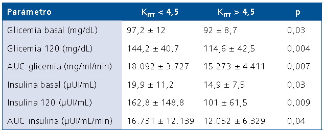 Al dividir los casos según KITT, 103 (80,5%) fueron insulino resistentes y 25 (19,5%) fueron no insulino resistentes. No hubo diferencia significativa para la edad y el IMC entre los 2 grupos.