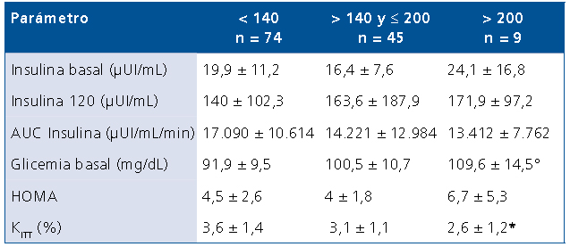 De acuerdo a la glicemia postcarga, 45 casos (35,2%) tenían intolerancia a la glucosa y 9 (7%) tenían diabetes. La Tabla 3 muestra que la glicemia basal fue significativamente más alta en los intolerantes a la glucosa y diabéticos comparados con los casos con tolerancia a glucosa normal. De los otros parámetros, sólo el TTIIV fue significativamente diferente entre los 3 grupos, identificando a los más insulino resistentes (p = 0,025).