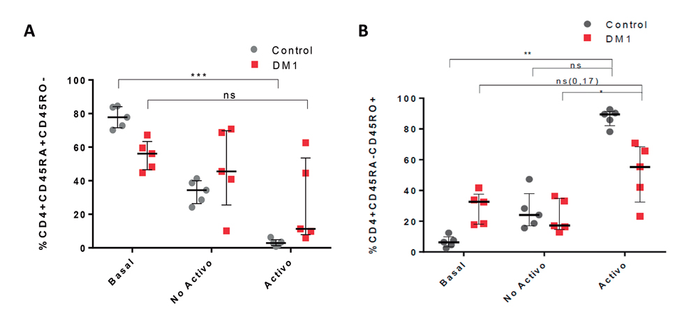 Los resultados respecto a la generación de células T de memoria tras una activación vía TCR (con anti-CD3, anti-CD28 y suplementado con IL-2) en el grupo de adultos con DM1 y controles sin DM1, mostró un aumento significativo en las células activadas respecto a las no activadas en el grupo control, fenómeno no observado en el grupo de adultos con DM1. Esta característica, sumada a la pérdida del marcador de condición naive, daría cuenta de una respuesta alterada, que se condice con el condicionamiento a nivel sistémico de individuos con enfermedades autoinmunes en etapas avanzadas24.