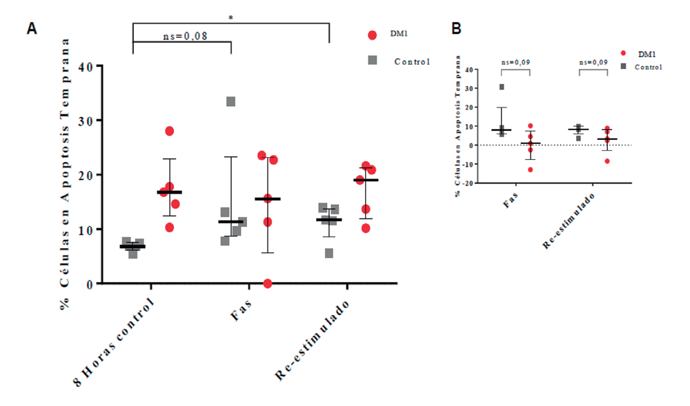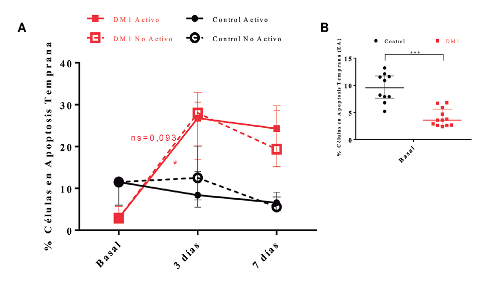 Figura 2. Porcentaje de células en apoptosis temprana. A: conjunto de las curvas de crecimiento celular de los grupos DM1 y control en condiciones de activación y sin activación. B: comparación entre el grupo DM1 y control en condiciones basales. Valores expresados como mediana y rango intercuartílico. *p = 0,0013. ***p < 0,001.