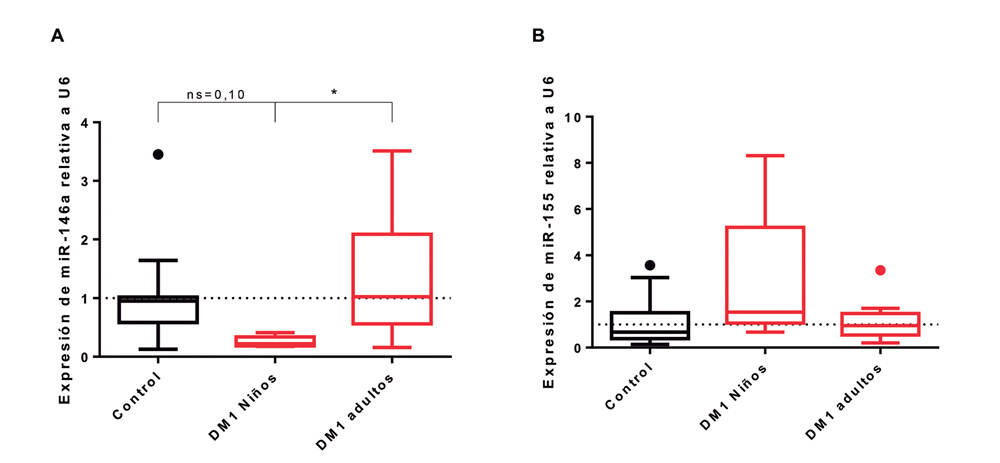 Figura 4. Comparación de expresión relativa de miR-146a y miR-155 en adultos y niños con DM1. A: expresión relativa de miR-146a; B: expresión relativa de miR-155. Valores expresados como mediana y rango intercuartílico.
