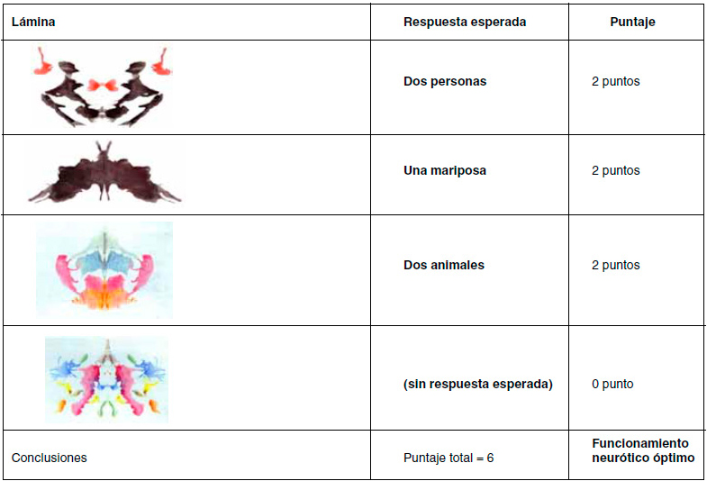 El test de Rorschach2 es una prueba proyectiva de 10 láminas de manchas ampliamente usada para evaluar la estructura de la personalidad y, en particular, la prueba de realidad3 como uno de los componentes principales de una personalidad equilibrada. El mantenimiento de la prueba de realidad se mide a través de las respuestas esperadas en 4 láminas específicas y predeterminadas para este objetivo, otorgando un puntaje denominado índice de realidad4 que define si el funcionamiento del evaluado es psicótico, limítrofe, neurótico u obsesivo. La paciente obtuvo un índice de realidad con puntaje 6/8 que corresponde a un funcionamiento neurótico óptimo, es decir, un ajuste adecuado a la realidad consensuada (Tabla 1).