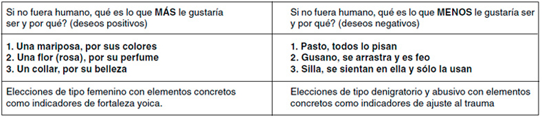 El Cuestionario Desiderativo6 (que expresa un deseo) es una prueba proyectiva que sitúa al evaluado en una posición fantaseada de pérdida de identidad humana para forzar la aparición de deseos inconscientes respecto a sí mismo y examinar el grado de fortaleza del yo. Las respuestas de la paciente dieron cuenta de una fuerte identificación femenina en los deseos positivos con indicadores de fortaleza yoica, es decir, la capacidad para manejarse en su vida con adaptabilidad y flexibilidad para enfrentar distintas situaciones y resolverlas, para instrumentar defensas suficientes cuando esas situaciones se vuelven hostiles o peligrosas; en sus deseos negativos manifestó una angustia tolerable a los propios miedos más bien asociados a experiencias de maltrato, daño y abusos (Tabla 2).